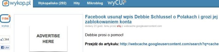 After I announced the Facebook block on this site, I received hundreds more death threats and vile anti-Semitic attacks from both Poles and Muslim fans of “One Direction’s” Zayn Malik. But no way they are anti-Semitic, right? Also, a top Polish site celebrated the removal and censorship of my work, with a headline that reads (in Polish), a sarcastic “Debbie Asks for Help.” A screen capture of it is posted below. But, no way, they were complicit in the Holocaust, right? Sorry to tell you Poles, that this ain’t 1943, and your attempts to silence me and get my material–while successful briefly–failed. Miserably. Yakshemash, schmucks?