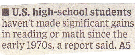 While kids a/k/a younger students made gains in math and reading, those gains wash out by the time they are in high school. As a result, we continue as a country to fall behind that of other Western industrialized nations. For the most part, their kids are improving constantly and even in high school, while our kids haven’t improved since 1971. Well, technically, we’re up a “whopping” ONE point in reading and only TWO points in math since 1971. Very sad. How much tax money have we thrown down a black hole to improve education in those 38 years? More than the gross national product of lots of third world countries combined, with nothing to show for it.