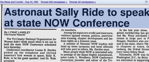 Sally Ride’s open lesbianism is the other reason she became the false hero she is. Much of the top echelons of the feminist movement then were lesbians–people like Eleanor Smeal and others. And lesbians were especially loved and promoted. It’s no accident that the first woman to go into space was a lesbian. They didn’t pick her lightly. Sally Ride wasn’t just a woman and a lesbian. She was a NOW activist, speaking at their conventions.
