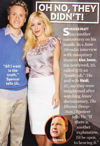 Unfortunately, Pratt and Montag Pratt are now America’s most famous “right wingers.” And now, they are the most famous 9/11 Truthers. They endorsed John McCain and the Second Amendment, having photogs film them buying guns and practicing at a shooting range. Good for them. But these idiots are not my guide or the affirmation of my views. And anyone who praised them–as many conservative blogs have over the last year–will have to wonder why they gushed over these two who now support a theory that America, not Bin Laden, was behind the 9/11 attacks. Oh, and they did it while appearing on the insane, anti-Semitic, anti-Israel Alex Jones’ show. Even the liberal US Magazine commented, “OH NO, THEY DIDN’T!” Sadly, Oh, Yes, They Did. From the magazine’s July 20th issue:
