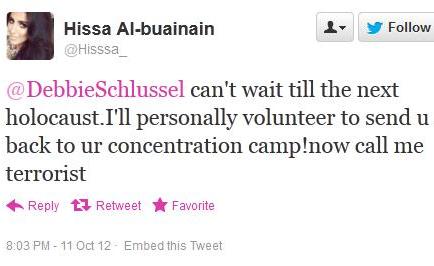 As you’ve probably heard, there is so much anti-Semitism in France now that “a good Jew” (said sarcastically) and, now, “a dead Jew” have become the most popular trending terms on Twitter in France. That’s because, as I was one of the first to write about well over a decade ago (and then my best lines on this ended up shoplifted for “Mark Steyn’s” book), Muslims may now constitute a third of the population in France (and because of illegal immigration, etc., nobody actually knows how many Arabs–most of them Muslim–are in the country.) And, given this, I suppose it’s no surprise that this Arab Muslim French fashionista, complete with a high-fashion blog, sent me a tweet wishing for the return of the Holocaust, so that she could personally send me to the concentration camps (see below). With the Internet, the French Twitter pogrom/jihad against the Jews reaches all shores, including mine. When I retweeted this (follow me on Twitter) so that the world could see, this cowardly snake, aptly named Hissa Al-Buainain made her Twitter account private and blocked me (as if I would care to read a thing this typical Jew-hating Muslims) says. She also dropped her last name from her twitter account. Yup, this hateful, anti-Semitic Muslim thug-ette actually expects to get a job in international security. The Nazi guarding the henhouse. As the granddaughter of Holocaust survivors (my mother was born in Bergen Belsen concentration camp after it became a displaced persons camp), I know all too well what this French high-fashioned Muslim kalbeh wooskhah [“filthy bitch” in Arabic] wants to do to me, if given the chance.