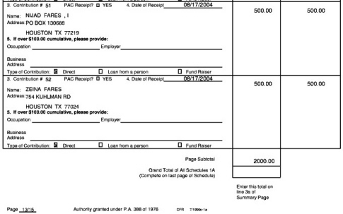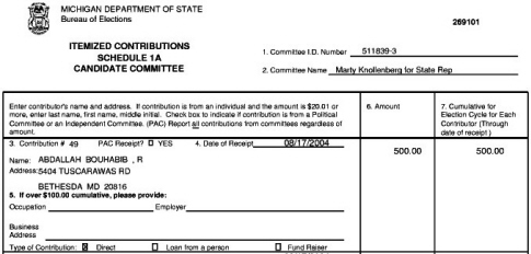 American Lebanese activists in the “March 14th Coalition” (a group of Christians, Sunnis, Druze and others who are working to free Lebanon entirely of Syria and Hezbollah) say that Bouhabib worked against them and supported Syria’s occupation of their country.Bouhabib and Mr. and Mrs. Fares gave Marty Knollenberg $500 a piece. That might seem small to you, but it’s the maximum allowed under Michigan law per election cycle.