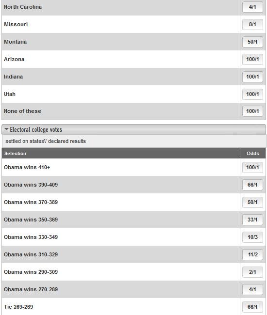 Second, although these odd clearly show Obama to be a heavy favorite, we should always understand that the odds offered by any bookmaker are not necessarily a prediction of the outcome. But rather, they reflect the odds necessary to compel sufficient betting on either side to make the bet profitable to the bookmakers. Obviously if every bettor bet on Obama and Obama won, the bookies would lose, and if every bettor bet on Romney and Romney won, the bookies would lose very big. But, of course, that does not happen. Rather, the odds are set and the bets are placed on each side such that the bookies expect to make money regardless of who wins. Please take my word on this, but if your betting strategy is to always place your bets on a heavy favorite, you will lose… and lose big, and it won’t take long to do so. The latest World Series is a case in point: Detroit was the clear favorite and San Francisco was the underdog.