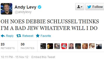 If you’re not familiar with Levy, you’re like most Americans. He’s the equivalent of an insect pissing. No one notices. And that just kills the easily riled, thin-skinned, unfunny so-called comedian. He thinks he’s funny, but most people have never heard of him and most of those who have don’t find him funny, which is why he’s on at three or four in the morning on FOX News, and that’s where he’ll remain. He has a following on Twitter among the humorless conservatives who are so humor-challenged and desperate that they’ll fawn over any such metrosexual girlieman who is part of FOX News’ barely-watched late night show, “Red Eye.” He’s a full-time employee of News Corp, and he’s also a self-hating Jew, who has repeatedly jumped in to support Twitter jihads and cyberpogroms of some anti-Semites on the right who’ve praised Muslim death, rape, and torture threats on my life (despite the fact that I never contacted nor had any interaction with him until yesterday). In addition to comparing Israel to HAMAS, Andy Levy thinks those threats are funny, too. Yup, Roger Ailes employs this self-hating, shorter, blond-streaked Rachel Maddow lookalike.