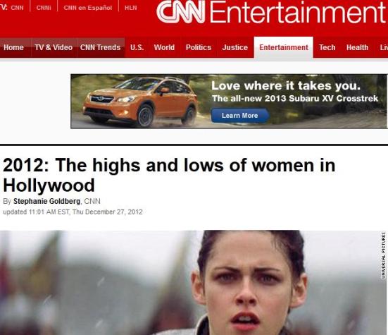 The feminists at the Coran/Crescent News Network, CNN (a/k/a are Al-Jazeera English #2), are upset with me and list one of my movie reviews as one of the “Lows for Women in Hollywood” of 2012. That’s a badge of honor. My “crime” is pointing out that all of these “she-man” warriors in the movies of late aren’t realistic, that they are absurd fantasies of the Rosie O’Donnell/”View” Hags/Gloria Steinem/Eleanor Smeal crowd on crack, and that men are still the physically stronger sex in real life. But these idiots would rather stick to their delusional cinematic propaganda that Kristen Stewart and Jennifer Lawrence can best men twice their size and weight.
