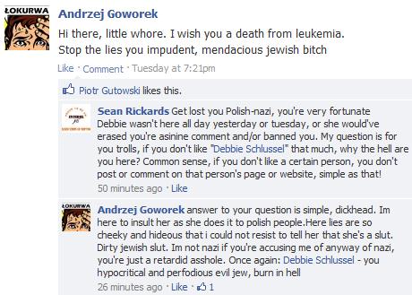Last year, I wrote a column about Polish complicity in the Holocaust. Thereafter, this site came under non-stop attack and hacking by anti-Semitic Poles (redundant phrase) intent on showing me how Jew-friendly they are by telling me such things as “Only Good Jew is Dead Jew [sic]” and sending me sexually explicit anti-Semitic pictures. We had to take various expensive security measures still in place and still costly, in order to keep this site up. But I keep getting hacked by them and receiving attacks, such as the ones mentioned in the October 2012 tweets below from the “Polish Bombers Group,” which also threatened my life in e-mails. And I keep receiving death threats, hate mail, and other non-stop harassment from Poles. Here’s the latest from my Facebook Fan Page (join me on Facebook) from Tuesday and today (thanks to reader Sean Rickards for coming to my defense):