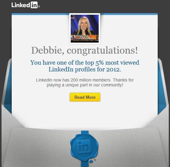 Recently, LinkedIn notified me that I am among the top 5% most viewed LinkedIn profiles for 2012. See the notice below that LinkedIn e-mailed me. If you’re not in my network (and therefore, I’m not in yours) on LinkedIn, you should change that by sending me a LinkedIn invitation to connect, and I’ll accept (unless you are one of the legions of stalkers, death-threat senders, or Nigerian scammers). Do that by sending the invitation to me at my LinkedIn profile. And thanks for putting me among the top 5% of LinkedIn’s most viewed for last year (which, based on the math, means that I’m in the top 10 million, likely along with you).