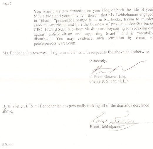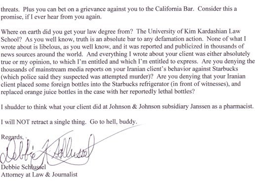 Now, I’ve heard everything. An Iranian woman who apparently attempted to poison Starbucks customers gets away with it, and her lawyer threatens me for writing about it. Yup, that’s what happens in America today. And, too often, people are scared away from the truth because of it. Because of empty, baseless threats by lawyers.