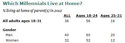 In 2012, 36% of the nation’s young adults ages 18 to 31—the so-called Millennial generation—were living in their parents’ home, according to a new Pew Research Center analysis of U.S. Census Bureau data. This is the highest share in at least four decades and represents a slow but steady increase over the 32% of their same-aged counterparts who were living at home prior to the Great Recession in 2007 and the 34% doing so when it officially ended in 2009.
