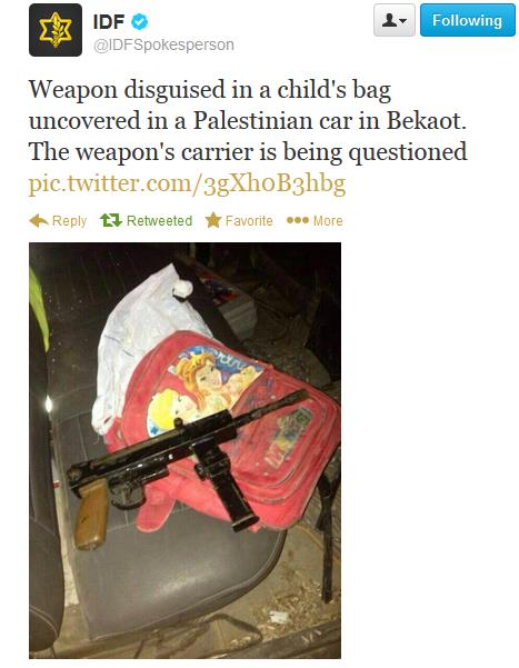 Torsten, the typical low-info voter, fails to acknowledge that Palestinian-Arab incitement of their children to attack and kill Jews is institutionalized like nowhere else in the world. Certainly in America, we do not place in our textbooks that any religious group is desrving of obliteration. And whether a child was wearing the backpack or not does nothing to mitigate the fact that Palestinian Arabs violate all international laws and Geneva Conventions in their efforts to attack Jews. What do you suppose, Torsten, was the intention of the person who was trying to sneak that weapon into Israel? For the odd American with mental issues to go postal in a school is bad, yes. But nobody would argue that this Arab was mentally ill. Only that he/she was doing what their schools and mosques exhort them to: Kill Jews. Fail, Torsten.