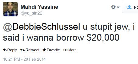 Debbie, I think this guy is of Persian origin, due to how he physically looks like (I’m not being a racist or a bigot on it, I have some friends who are of Iranian, and they look a little different from those who are of Arabic origin and lineage), anyway, regardless of his national identity, I’m not too surprised with this guy’s spiteful anti-Semitic rubbish. So he wants to borrow $20,000 from you (which you probably don’t have) for some type of loan for god knows what.