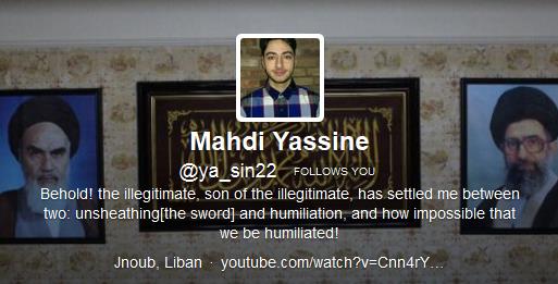 Hey, it’s another set of peaceful messages from the “Religion of Peace,” this time from a Lebanese Shi’ite Muslim Hezbollah and Ayatollah Khomeini fan (this goes for 99.999% of Shi’ites). I get these in e-mail and on social media like Twitter and Facebook on a daily basis. Here’s the latest hate tweets from Mahdi Yassine who follows me (follow me on Twitter). He says he’s from the Hezbollah stronghold of Jnoub in South Lebanon. Note his photos of his idols, the Iranian ayatollahs, including Khomeini. Note also the anti-Semitic Hezbollah recruitment video (featuring Hezbo leader Hassan Nasrallah’s calls for martyrdom and jihad) that is in his Twitter bio (which I’ve posted below) at the end. Should I be concerned? I am.