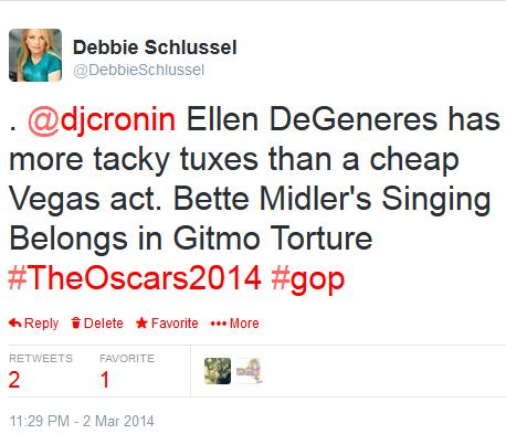Ellen wore more tacky tuxes than a cheap Vegas lounge act. She looked like she emerged from “My Cousin Vinnie’s” mariachi band (yes, I know there was no mariachi band in “My Cousin Vinnie,” but if there were . . . ). And while she tries her darnedest to look and dress like a man, she has a lot more in common with every other chick comedienne: she ain’t funny. You’d think a woman who tries too hard to look male wouldn’t dare call a manly looking woman who tries her best to look feminine (Liza Minnelli), “a female impersonator.” But you’d be wrong. Ellen called her that, and it didn’t go over well. Chutzpah is what doubles for “funny” with Ellen. Here’s a tip: it ain’t. So, whaddya do when you don’t have the funny? You rely on dumb Twitterbomb photo stunts.