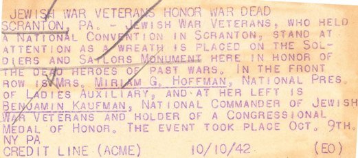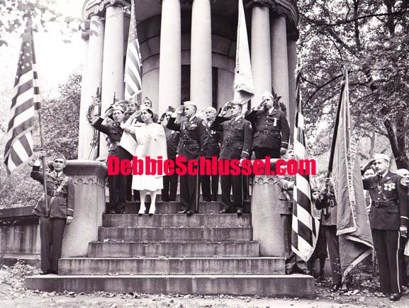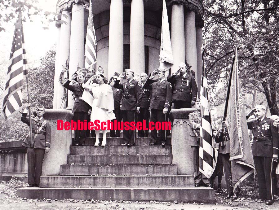 The Jewish War Veterans of the United States Leadership Remembers America’s Fallen Soldiers During World War II at the Soldiers and Sailors Monument in Scranton, Pennsylvania, October 9, 1942. The photo shows, among others Benjamin Kaufman, National Commander of the Jewish War Veterans and a Congressional Medal of Honor holder. . .