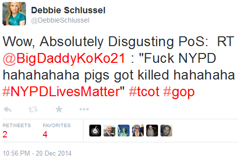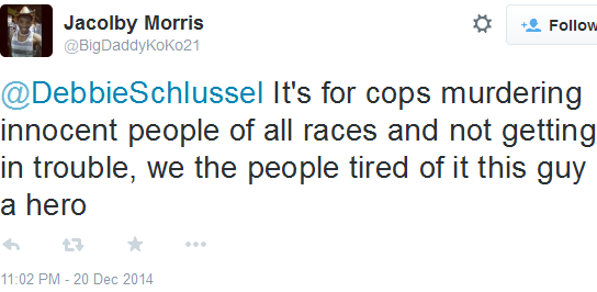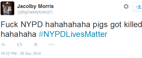 And then there are the many, many Black racists on Twitter and other social media who are cheering–yes, cheering!–the murder of these two cops, Rafael Ramos and Wenjian Liu. These so-called Americans cheering the cold-blooded murders of two cops (while they sat in their police vehicle doing nothing to anyone) are NOT Americans except by accident of birth. By the way, the racist morons don’t get that these cops weren’t even White. Rafael Ramos was Hispanic, Wenjian Liu Asian.