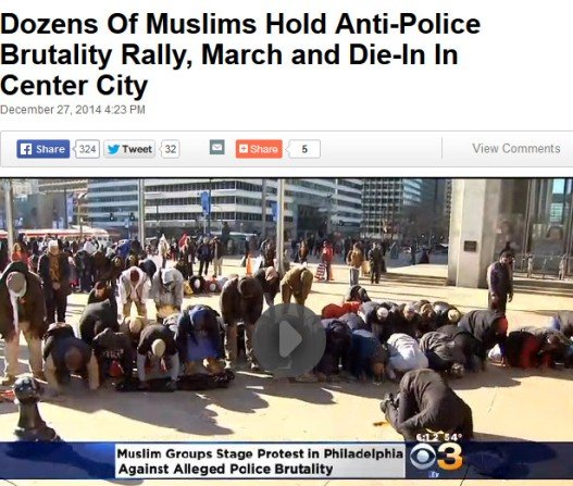 Over the weekend, yet another of the endless “Bleep the Police” rallies was held, this one in Philadelphia. It was hosted by Muslims, began with a Muslim prayer, and then included Muslim prayer by virtually all of the participants. As I’ve noted before, Muslims–including the Islamic terrorist group, CAIR–have organized, led, and claimed credit for these often violent rallies that urge violence against the police and have resulted in the murders of several police officers in New York and Florida. And Muslims have tried to use these rallies to proselytize and convert others to Islam, as well as to propagandize participants against Jews and Israel.