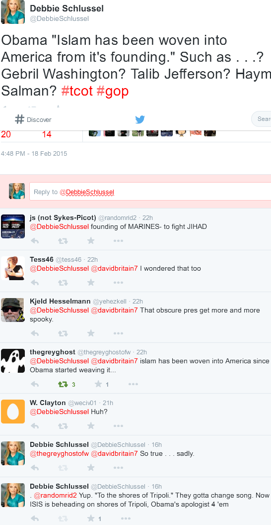 * “Islam has been woven into America from its founding.” It has? In what way? Were our founding fathers named Gebril Washington and Talib Jefferson? Was a guy named Haym Salman involved? Incidentally, Haym Solomon was an “evil Zionist.” Um, Judaism and Christianity have been woven into America from its founding. Islam was not. Not even close, unless you count Thomas Jefferson finally coming to terms with the fact that Muslims, then (as they are today), were behind all the troubles in the world. They were pirates who terrorized people and commerce on the high seas. Remember the Barbary pirates a/k/a the Berber Muslims? Um, they were also the ones who sold Blacks into slavery. Um, where does he think the lyrics, “to the shores of Tripoli [Libya]” come from in the U.S. Marine Corps Hymn? The First Barbary War, dummy. But “woven into America from its founding”? Um, NO. Never. Not even close.