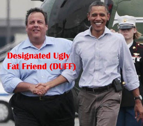 The story: a high school student, Bianca (Mae Whitman), who has two better-looking best friends, is told by her next door neighbor that she is the “DUFF”–Designated Ugly Fat Friend–for her clique of friends. At first, she is angry. But, then, she researches it, and realizes that she probably is the DUFF. The funniest part of the movie is when she searches “DUFF” online and popping onto the screen is a photo of Chris Christie a/k/a Chris ChrispieCreme with Barack Obama.