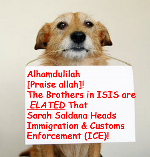 Ms. Saldana–who is a WNBA/Dinah Shore Classic candidate if I ever saw one–wants everyone in ICE to know that her dogs Mitzi and Daisy are soooooo cute, and she wants her agents (most of whom are paid over $100,000 per year and many around $140K) to show her if their dogs are cuter. Yup, this is the important Homeland Security Mission of the day. Forget illegal aliens, which include Islamic terrorists. Forget Muslims smuggling weapons to ISIS. The important bidniz of da day is cute doggies. BTW, this is the same ICE chief who gave $113 million back to the federal government, saying she didn’t need it, even as her agency deported fewer than .0002% of illegal aliens in America in the last fiscal year, a record low. She sounds like one of those crazy cat-lady hoarders who considers her dogs her “kids.”
