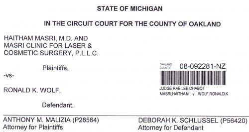 Over a year ago, my client’s friend, a Muslim nurse who was caring for his mother, had a nosejob performed on her by Dr. Masri.  Mr. Wolf lent her some money to help pay for the procedure and accompanied her to Dr. Masri’s office, where he says comments were made that a Muslim woman shouldn’t be seen accompanied by a Jewish man (Ron wears a very visible Star of David pendant).  My client said that the nosejob Dr. Masri performed on his friend was a cheaper substandard procedure and not the more expensive one for which they’d paid.  He wanted Dr. Masri to correct it or refund the money, and Dr. Masri refused and demanded more money.